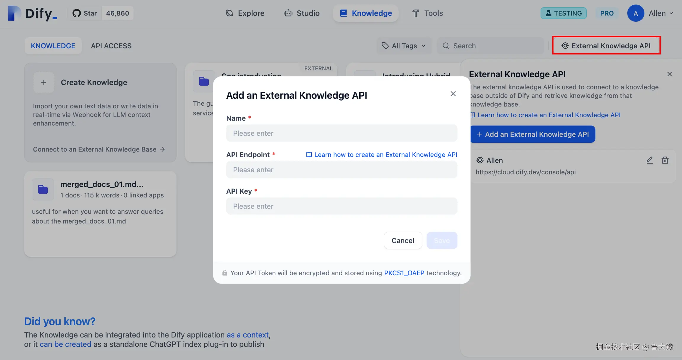 - 知识库的名称,允许自定义名称,用于区分 Dify 平台内所连接的不同外部知识 API;