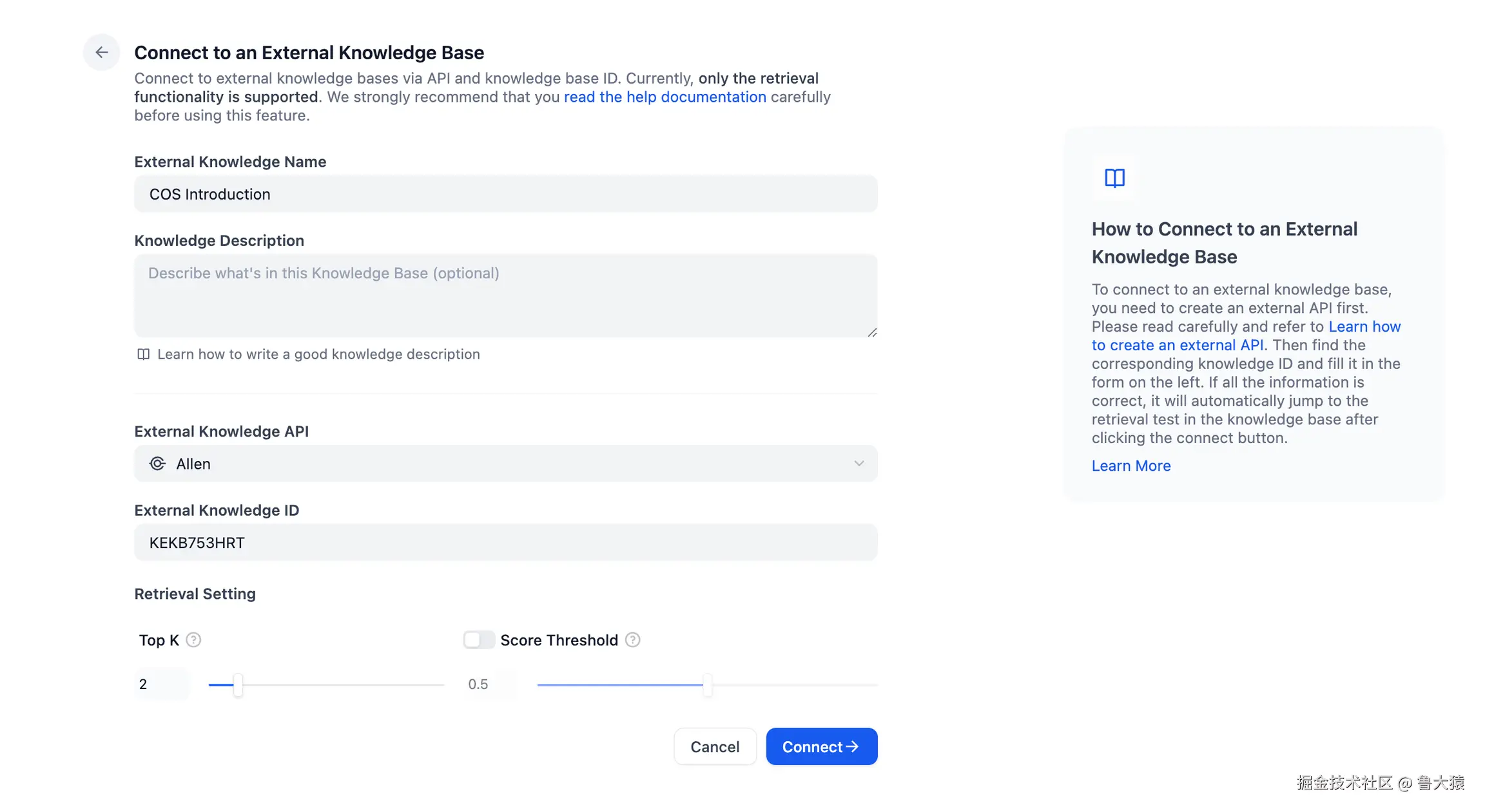 设置完成后即可建立与外部知识库 API 的连接。