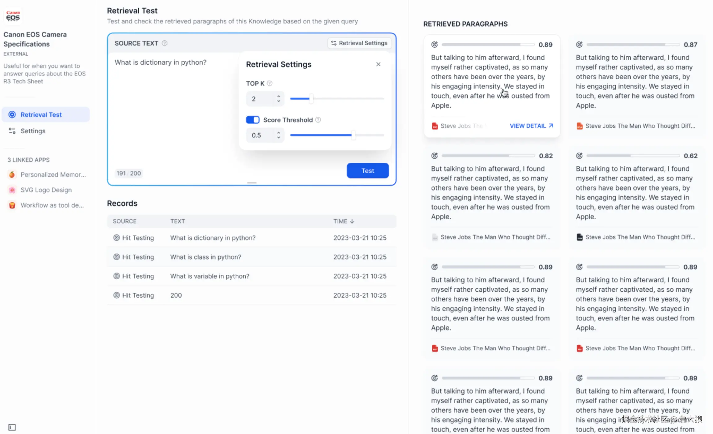 **Score 阈值:**文本片段筛选的相似度阈值,只召回超过设置分数的文本片段,默认值为 0.5。数值越高说明对于文本与问题要求的相似度越高,预期被召回的文本数量也越少,结果也会相对而言更加精准。
