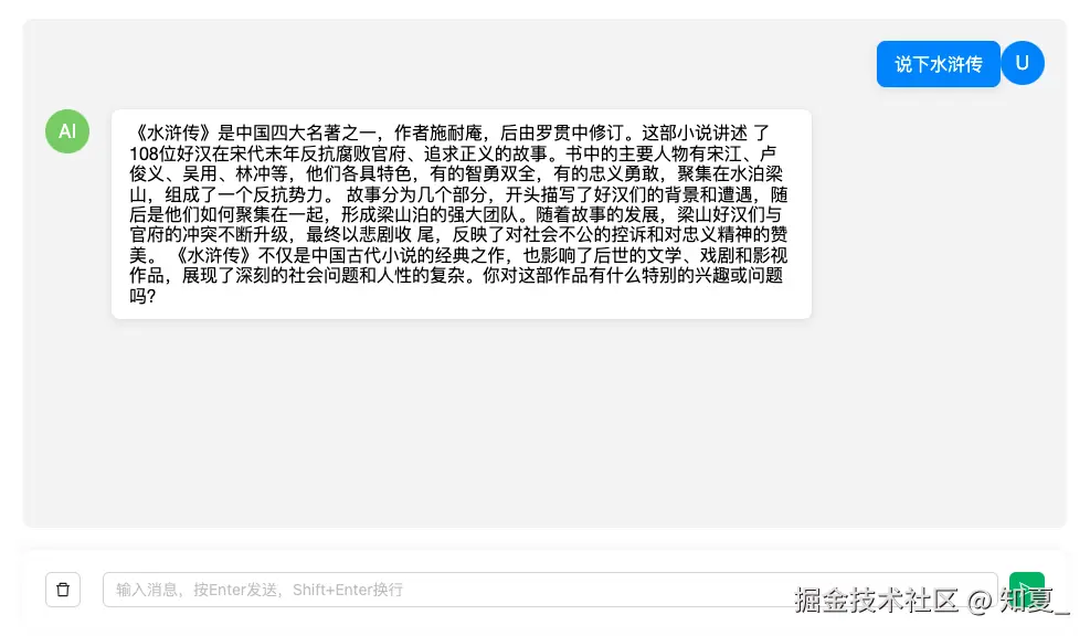 「机器人式的流式回复」效果如下,内容是逐步根据后端返回的数据进行展示的。(注:视频效果,请看语雀文档)