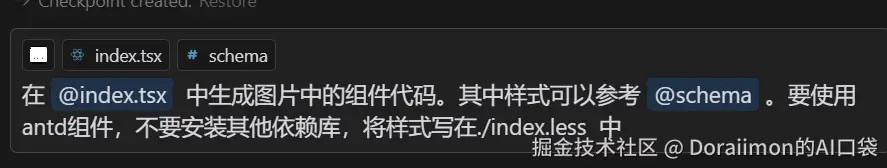 然后把这些CSS一起给到大模型,可以直接复制到Composer对话框;也可以创建一个临时文件,在Composer通过@Filles 的形式去读取这个文件。