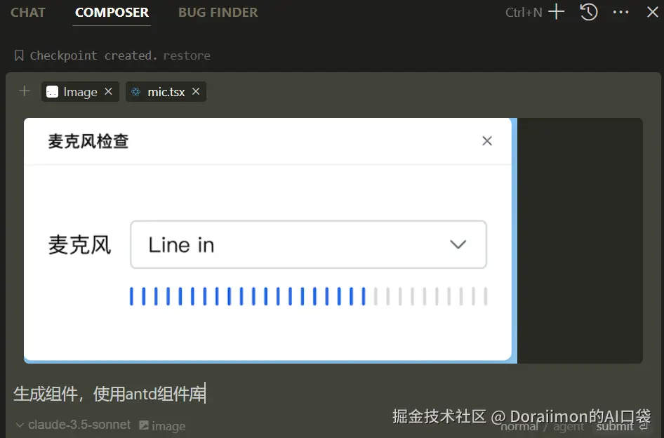 然后使用Cursor的Composer,按照图片内容生成组件。 (注意这里要用带多模态能力的大模型,例如Claude-3.5-sonnet)