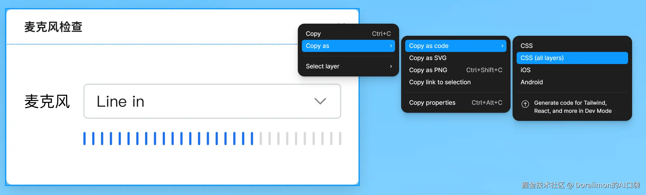 我们的需求是:实现一个麦克风检查功能,可以选择麦克风,并通过一个动画表现当前麦克风流的声音大小。设计稿(UI设计工具为figma)如下: