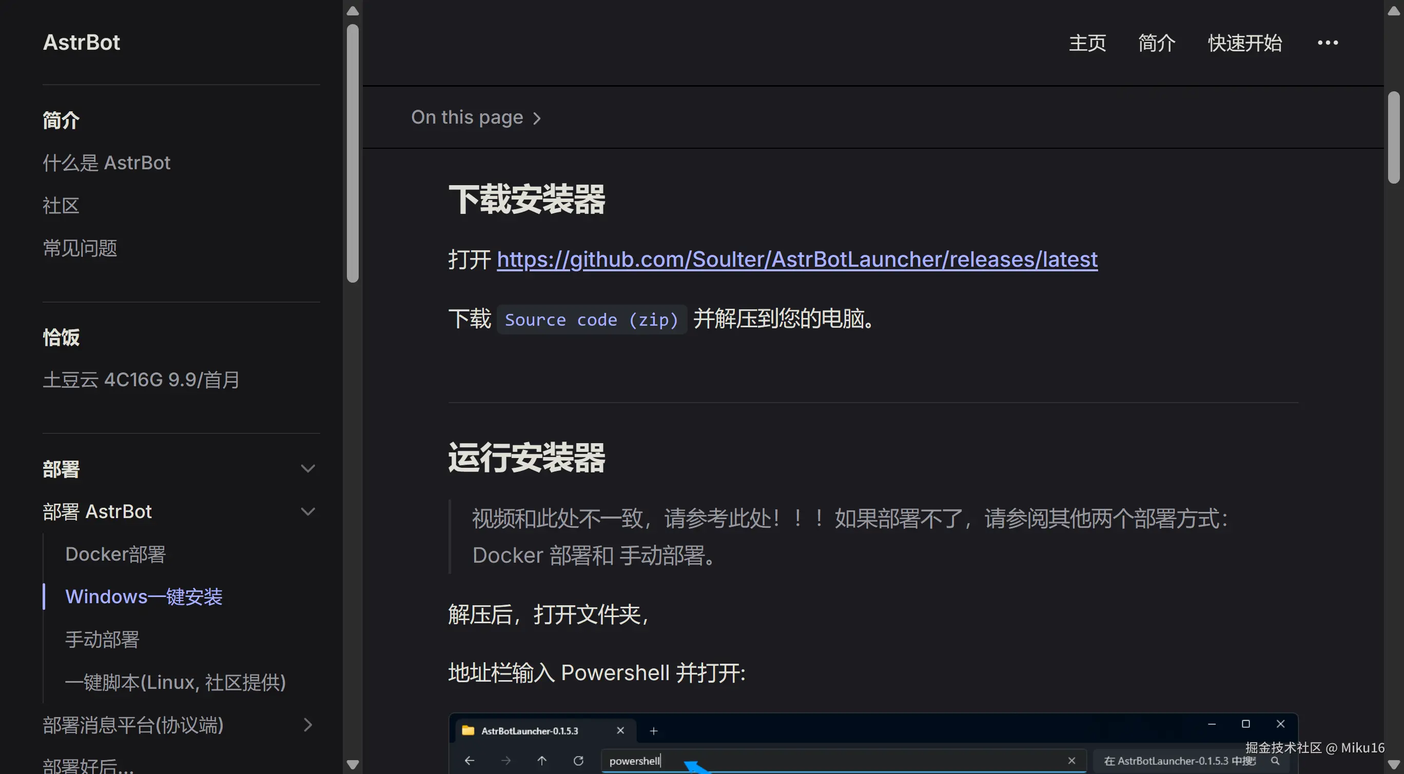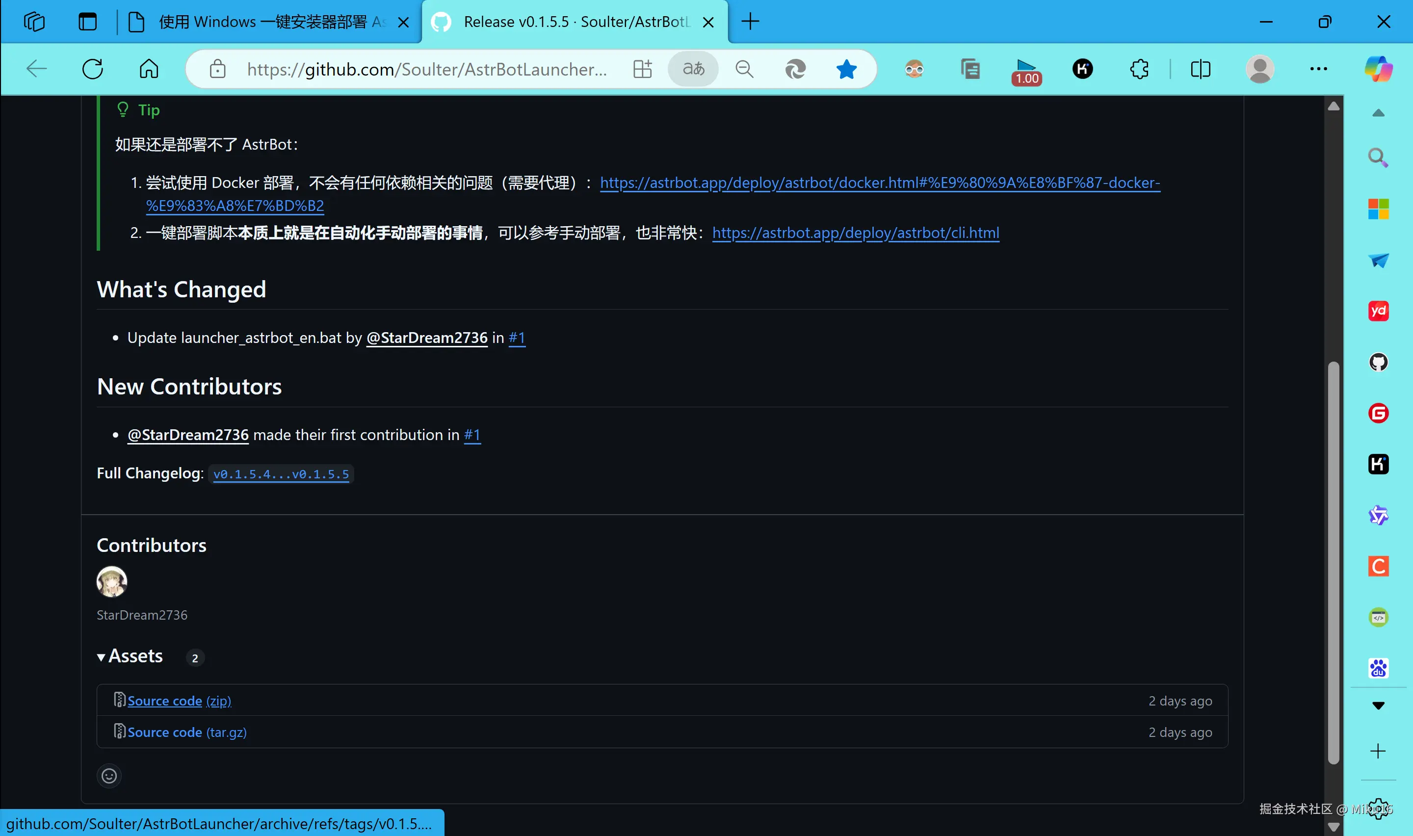随后下载安装器脚本。安装器是一个使用 Powershell 编写的脚本,用于拉取AstrBot的相关代码和安装依赖库。打开 github.com/Soulter/Ast… ,下载 Source code (zip) 并解压到电脑。