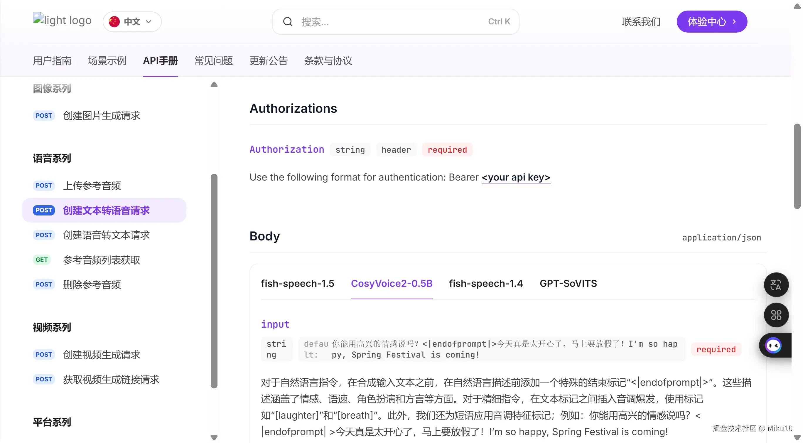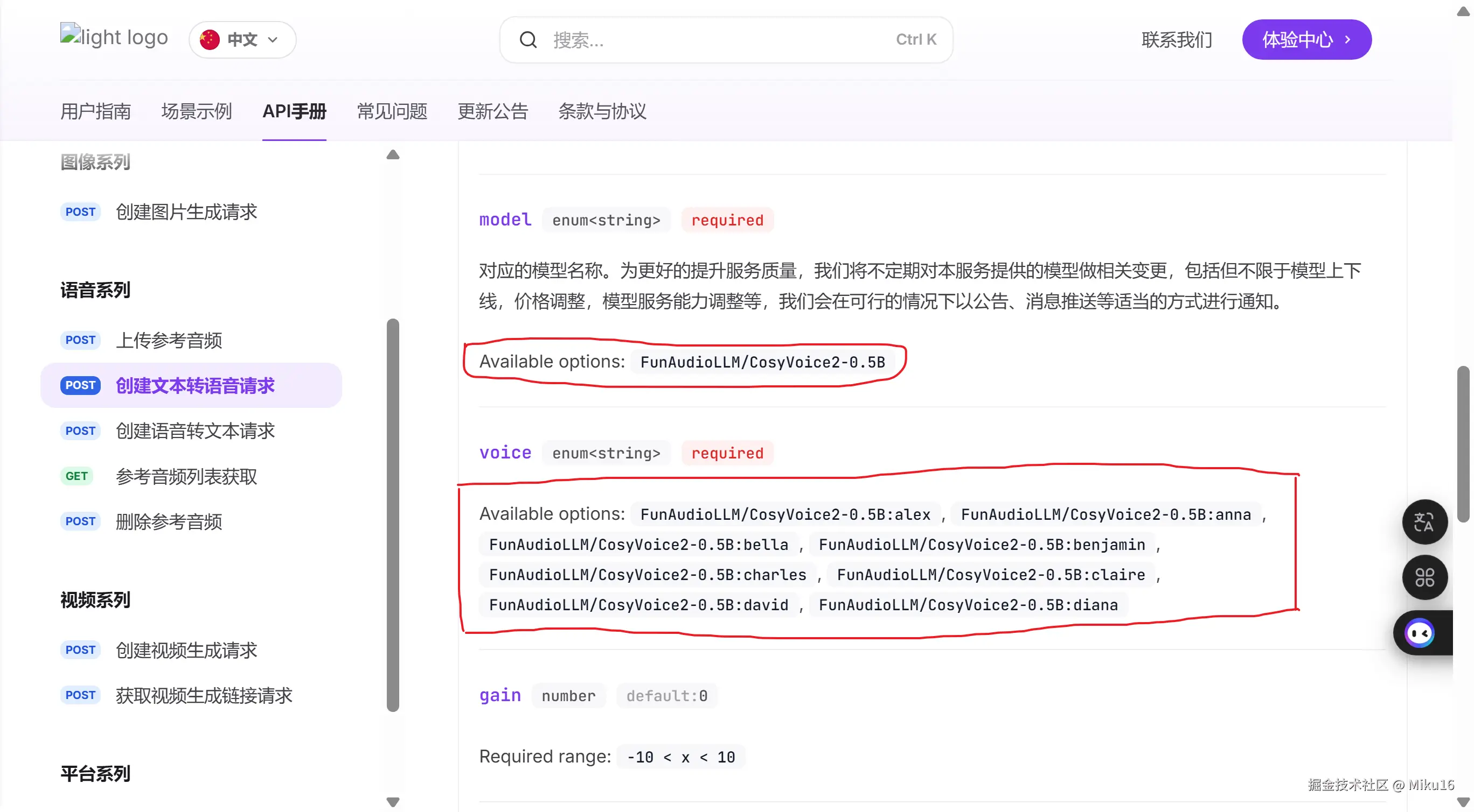 查阅SiliconFlow的api文档,在语音系列查看“创建文本转语音请求”类型。根据“Body”请求体配置参考来选择模型和声音。