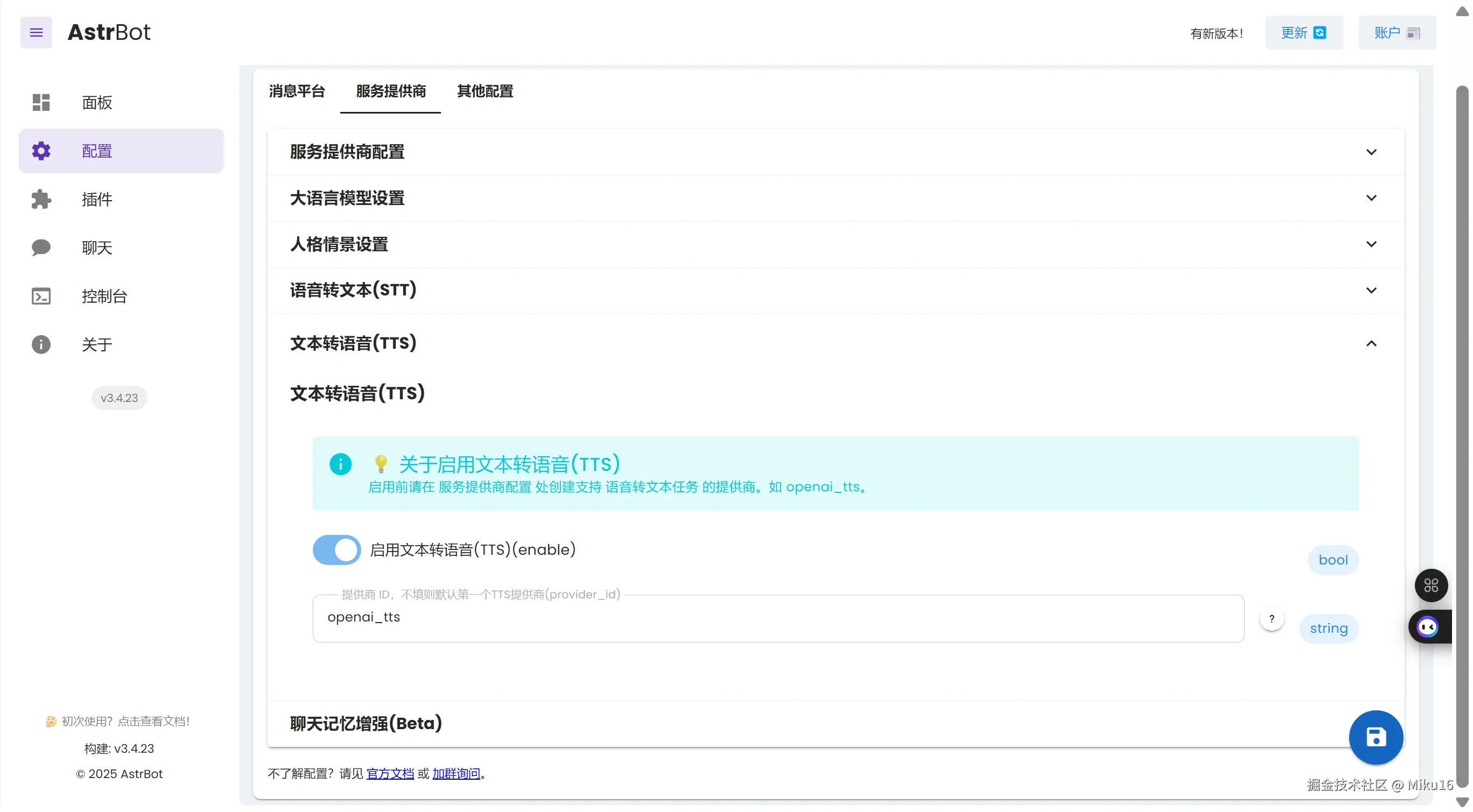 方法一:在服务提供商配置中设置TTS