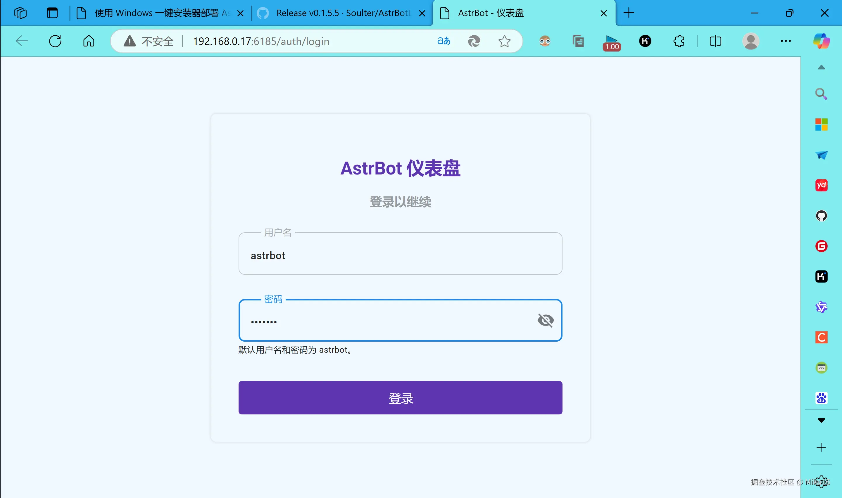 使用默认用户名和密码astrbot登录。