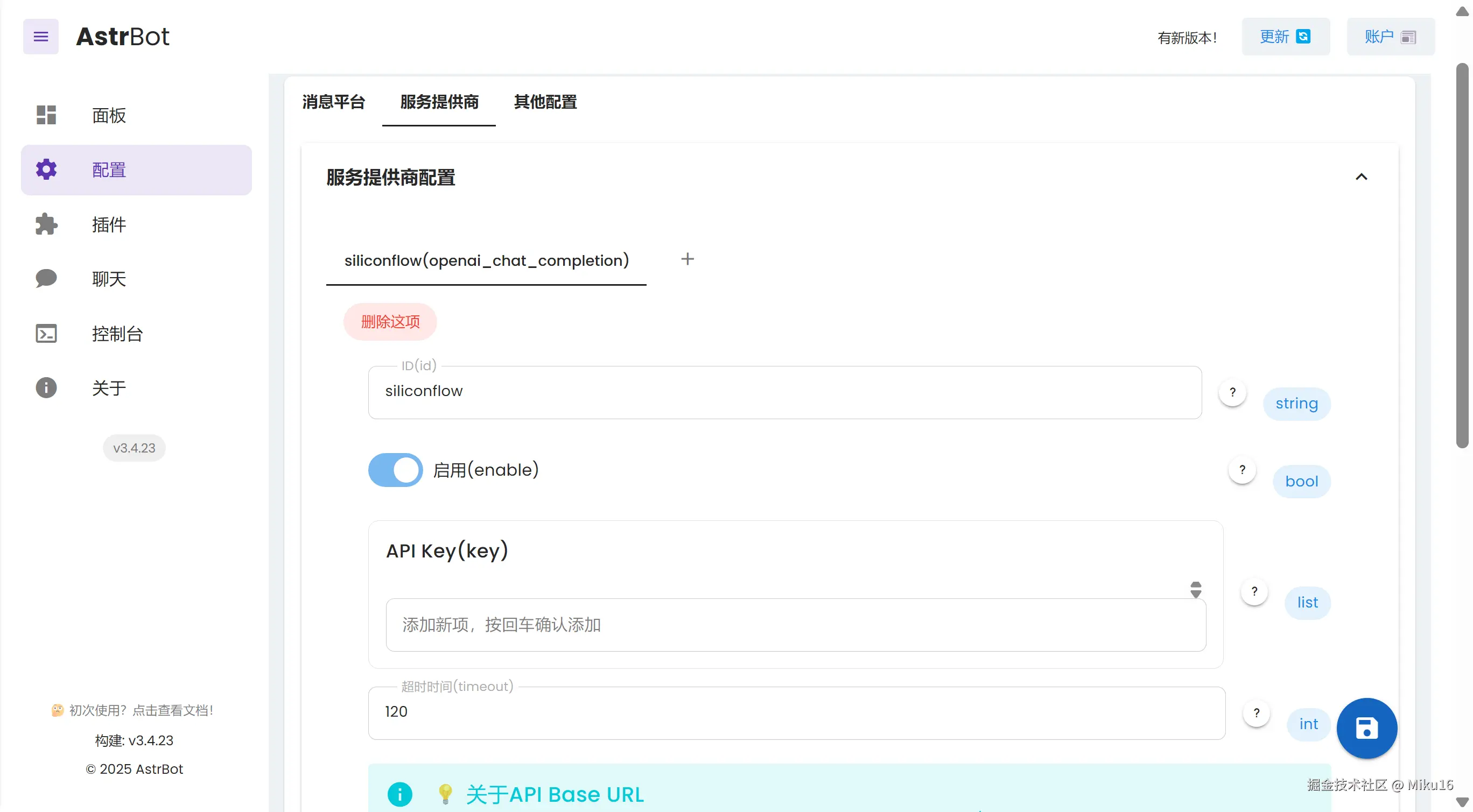 在SiliconFlow官网创建账号,新建密钥,将密钥填进AstrBot服务提供商的API Key,回车添加。