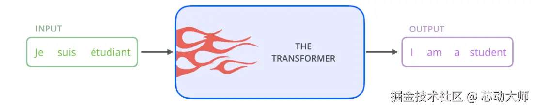 首先把模型看成一个黑盒,如下图所示,对于机器翻译来说,它的输入是源语言(法语)的句子,输出是目标语言(英语)的句子。