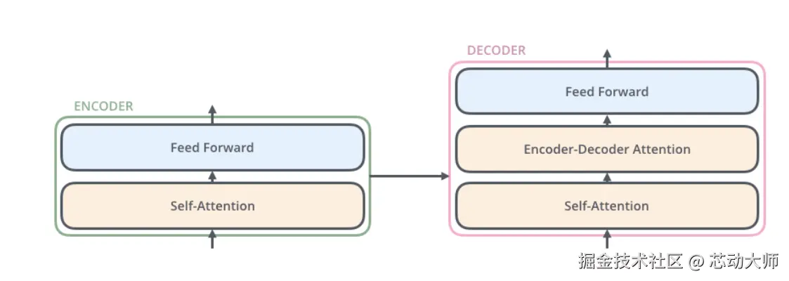 Decoder和Encoder是类似的,如下图所示,区别在于它多了一个Encoder-Decoder Attention层,这个层的输入除了来自Self-Attention之外还有Encoder最后一层的所有时刻的输出。Encoder-Decoder Attention层的Query来自前面一层,而Key和Value则来自Encoder的输出。