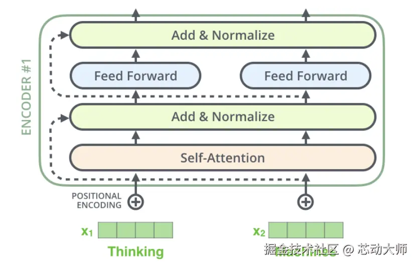 每个Self-Attention层都会加一个残差连接,然后是一个LayerNorm层,如下图所示。