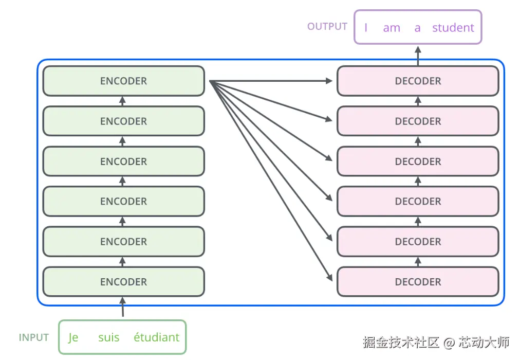 每一个Encoder的输入是下一层Encoder输出,最底层Encoder的输入是原始的输入(法语句子);Decoder也是类似,但是最后一层Encoder的输出会输入给每一个Decoder层,这是Attention机制的要求。