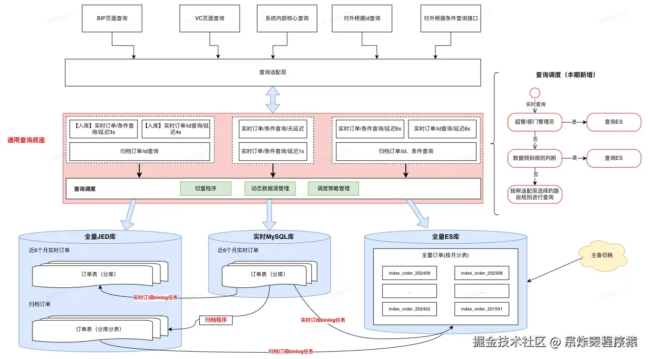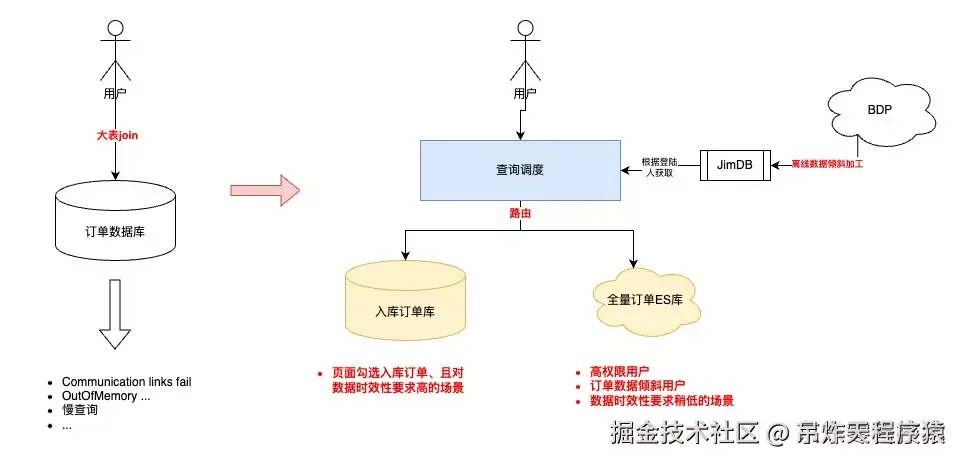 | 查询场景 | 面向采销、接口人、供应商、仓储运营提供包括采销员、单号、SKU、供应商、部门、配送中心、库房等多场景复杂查询 | 主要是按用户pin进行订单查询 |