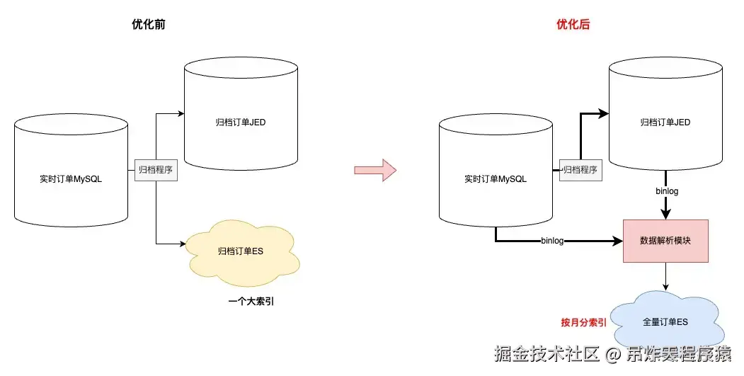 •其次,简化了归档程序流程,历史方案是程序中直接写入【归档JED+归档ES】,现在优化成只写入JED,ES数据通过【数据解析模块】完成,简化归档程序的同时,提高了归档能力的时效性