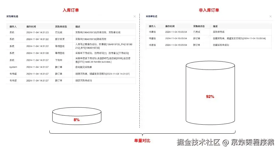基于历史数据、业务调研分析,采购订单只有8%的订单属于“需要实际送货至京东库房”的范围,也就是拥有完整订单履约流程、业务核心关注时效的。其余订单属于通过客户订单驱动,在采购系统的生命周期只有创建记录