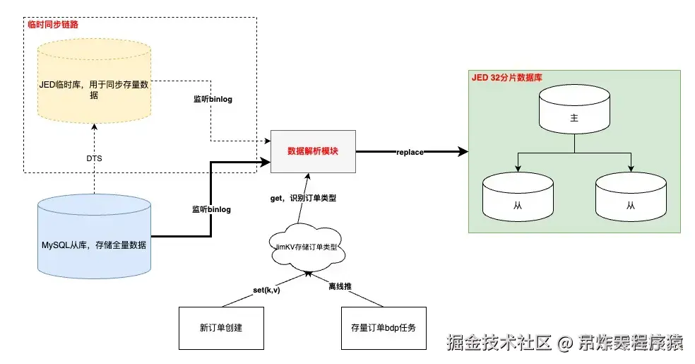 ◦如果在【数据解析模块】处理binlog时无法及时从JimKV获取到订单标识,会补偿反查数据库并回写JimKV,提升其他表的binlog处理效率