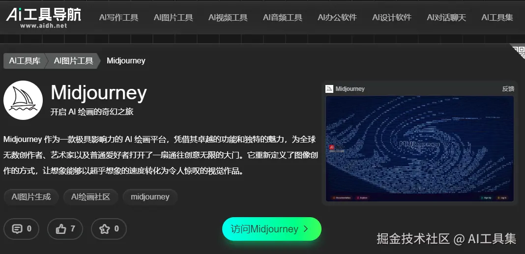 以一款热门的图像编辑AI工具Midjourney为例,在搜索框中输入Midjourney名称后,会跳转到该工具的详细页面。