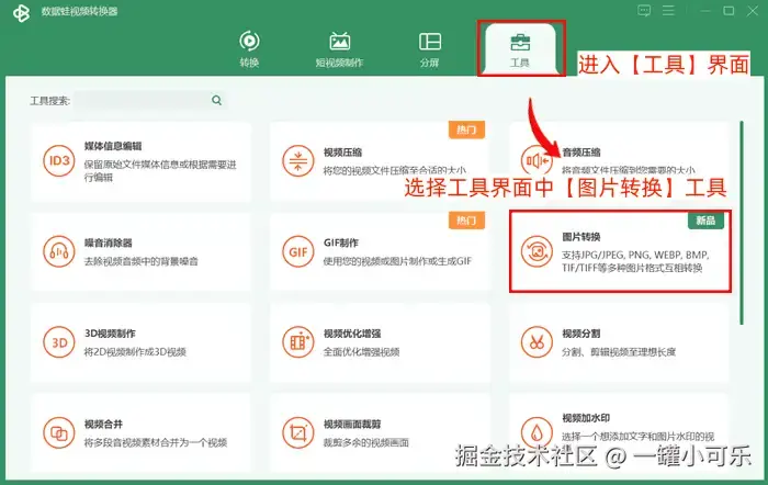 步骤1:在电脑端运行该应用,进入【工具】界面,选择工具界面中【图片转换】工具。