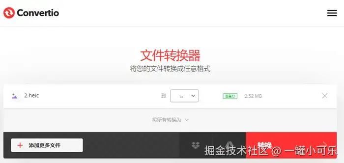 操作步骤: 进入Convertio网站,点击【选择文件】上传heic文件,然后选择目标格式为jpg格式,最后点击【转换】即可。