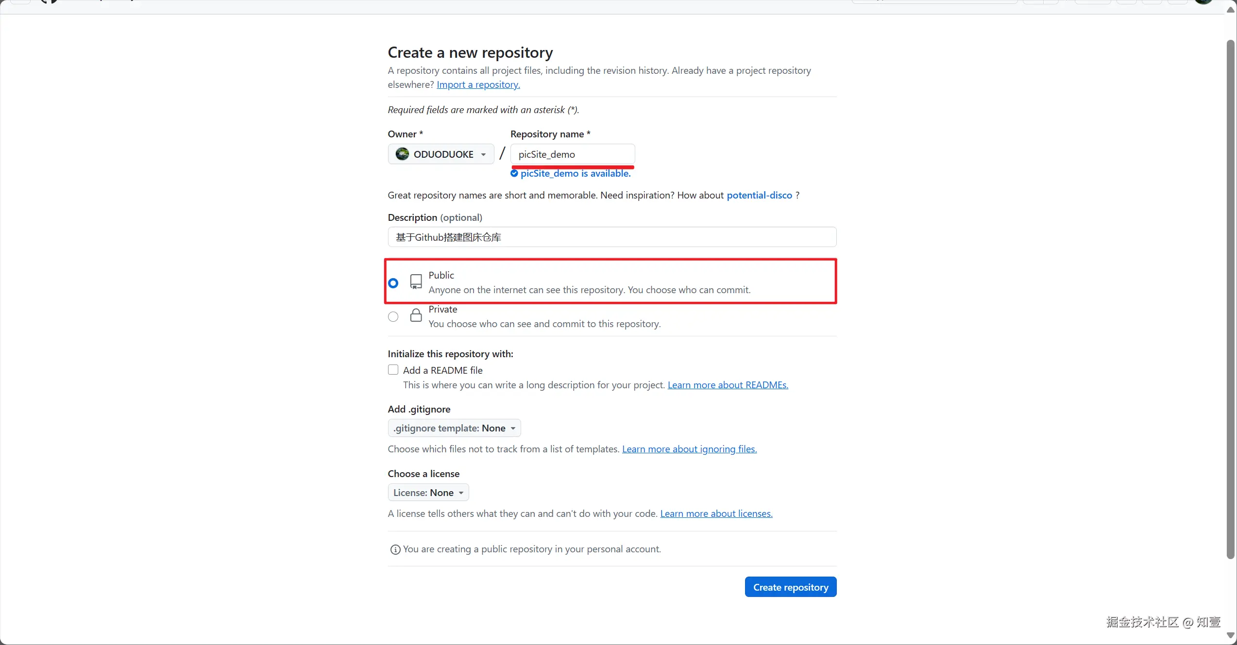 创建一个public的仓库,仓库名自定义即可。