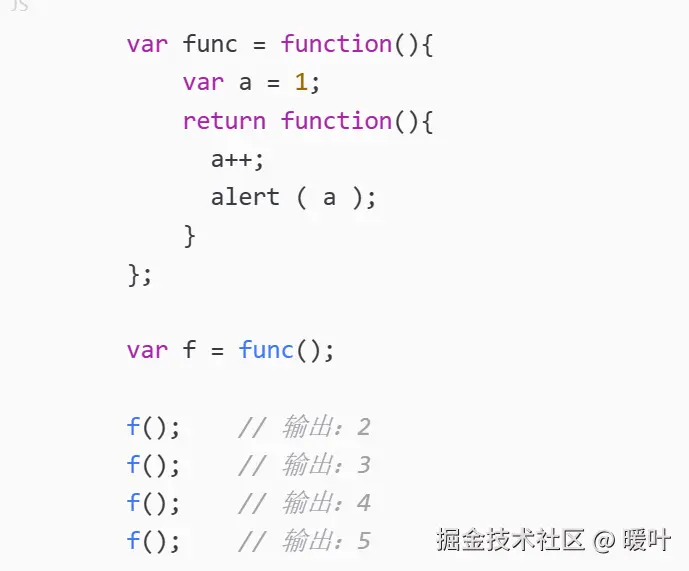 当退出函数后,局部变量 a 并没有消失,而是似乎一直在某个地方存活着。这是因为当执行var f = func();时,f 返回了一个匿名函数的引用,它可以访问到 func() 被调用时产生的环境,而局部变量 a 一直处在这个环境里。既然局部变量所在的环境还能被外界访问,也就是说基于标记清除法的垃圾回收机制不会回收这个局部变量。在这里产生了一个闭包结构,局部变量的生命看起来被延续了