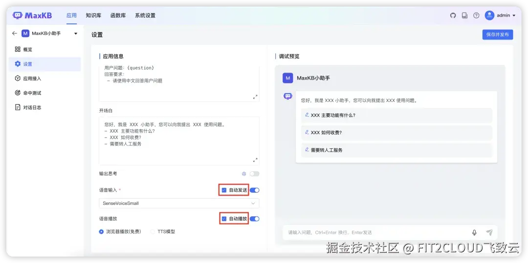在v1.10 LTS版本中,MaxKB支持自动发送语音问题及自动播放回答内容。在打开“自动发送”和“自动播放”选项后,即可为用户解放双手,实现提问与回答的快速响应,进一步提升人机交互的体验与便捷性。
