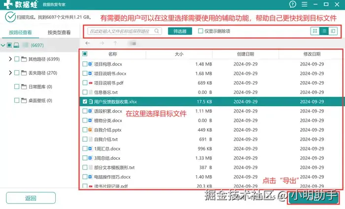 步骤2: 在软件的扫描工作结束后,选择自己需要恢复的文件,然后点击右下角的“导出”;