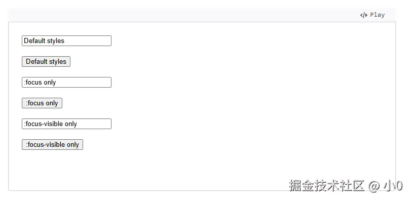 通过demo尝试可见:focus-visible only在按钮被点击时不会出现焦点框,只有键盘焦点才展示,但是focus则两种情况都会出现焦点框: