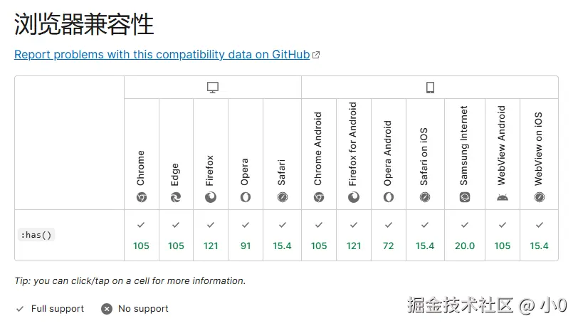 CSS 函数式伪类 **:has()** 表示一个元素,如果作为参数传递的任何相对选择器在锚定到该元素时,至少匹配一个元素。这个伪类通过把可容错相对选择器列表作为参数,提供了一种针对引用元素选择父元素或者先前的兄弟元素的方法。意思是某某元素如果匹配某某选择器,就会匹配。支持所有css选择符