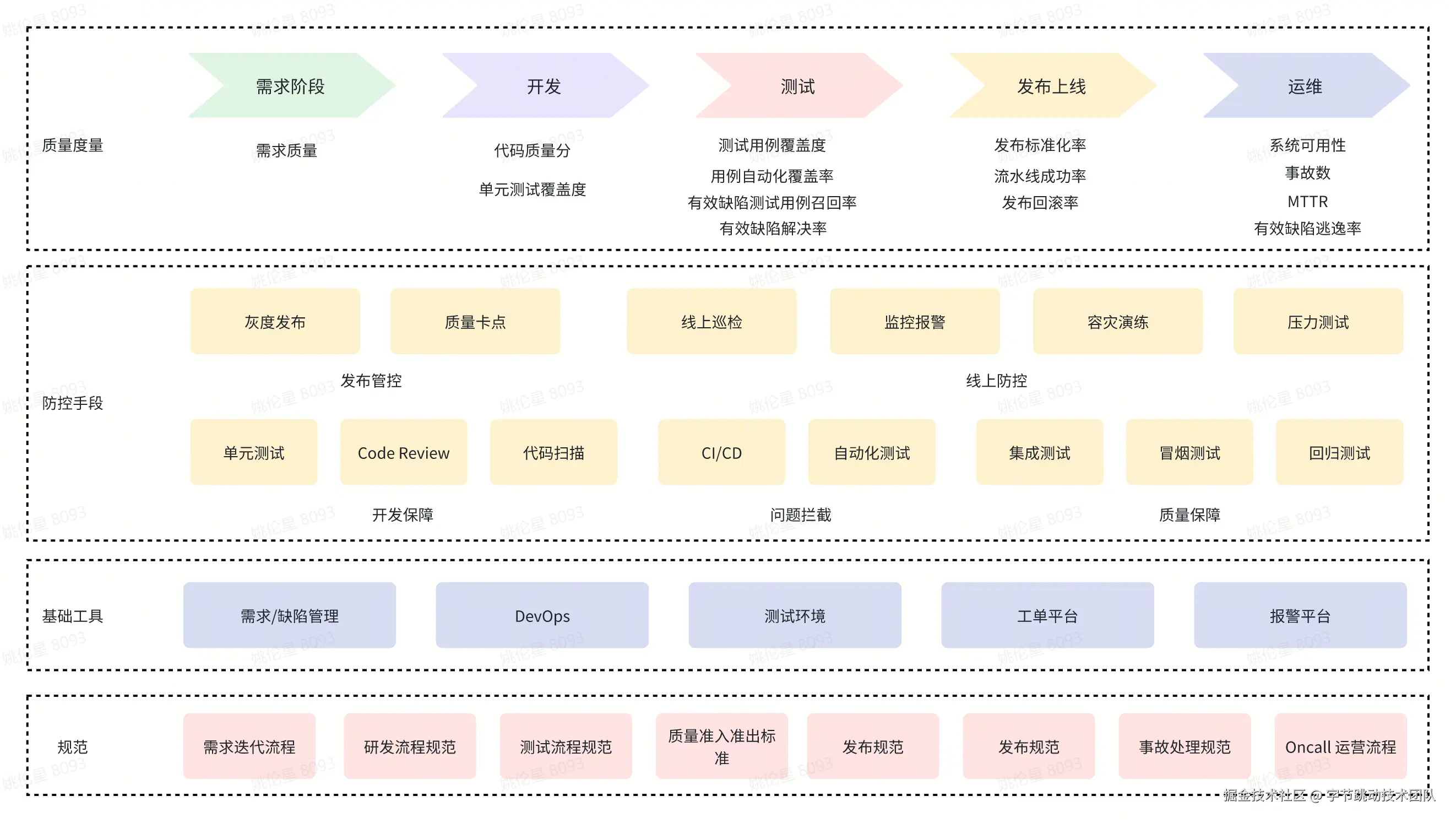 完整的质量保障策略,需要各个阶段的努力,常见的质量保障框架包括基础的规范、工具、质量防控手段和质量度量: