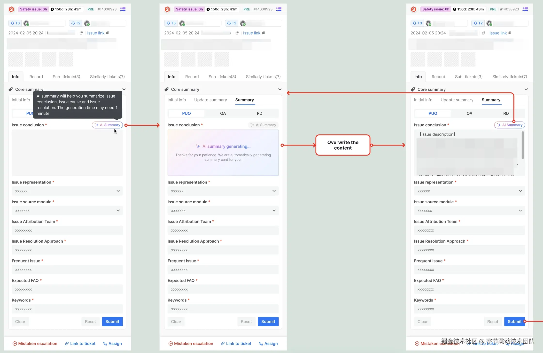 其次,AI 摘要生成功能则通过自动生成问题的总结,在群聊中梳理出问题描述、原因和结论,提供给不同班次的用户操作团队以保持问题处理的一致性。这一功能通过将所有的群聊内容传递给大型语言模型生成总结,从而避免因班次交接导致的上下文丢失,提高工单解决的连续性和效率。这些先进的 AI 功能减少了用户操作团队在票务处理上的重复性工作,让他们能够将更多时间投入到更具价值的任务中,不仅提升了团队的工作效率,也提高了用户问题解决的速度和质量,为用户提供了更优质的体验。