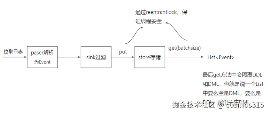 解析是将binlog日志解析为数据变更事件Event,之后需要放入存储区域中,使用Memory内存