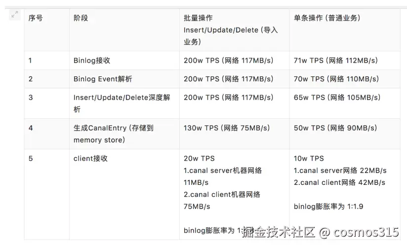 说明阶段越早结束,性能越高,比如不发送到消息队列,而是直接从canal内存缓冲区中获取消息去更新redis缓存,性能更高,但是随之而来的是数据管理问题及消息积压问题等。