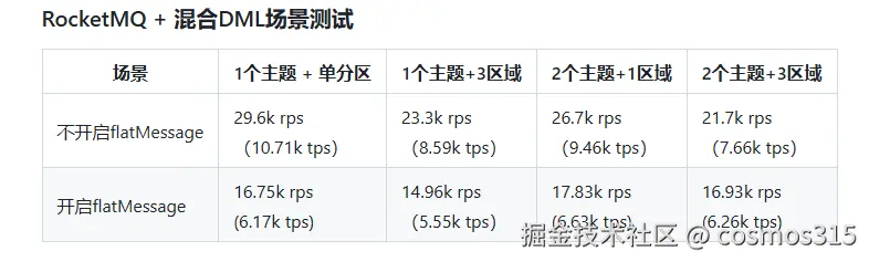 flatMessage模式,性能普遍比不开启flatMessage模式慢,主要就是protoobject的反序列化开销和小batch的发送成本,也就是说flatMessage是解析好的,而非flatMessage模式是没有解析好的message,相当于节约了一个步骤,发送到client端。后续可以通过更多的topic+分区追回。 (Message = List)