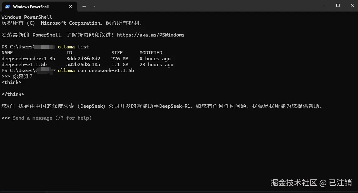 Tips:本文只是为了演示(工作电脑性能较差)而选择的 DeepSeek-R1 1.5b,但是如果你的电脑只能部署 DeepSeek-R1 1.5b,建议直接使用豆包,Kimi 和文心一言等~~