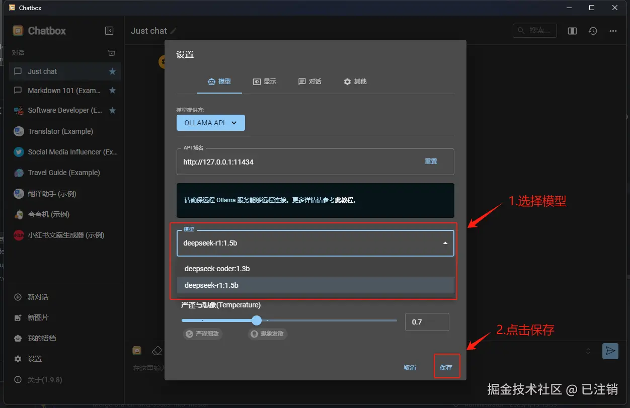 选择 Ollama API 选项,配置部署在本地的 DeepSeek-R1 模型。