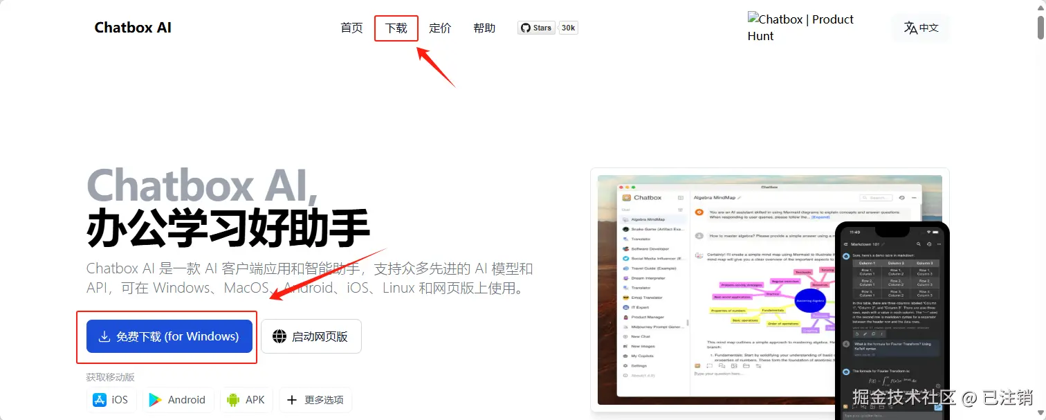 首先登录 ChatBox AI官网,下载 ChatBox 的安装包,如果长时间没有响应,你可以通过上面的关键字获取到 ChatBox 的安装包。
