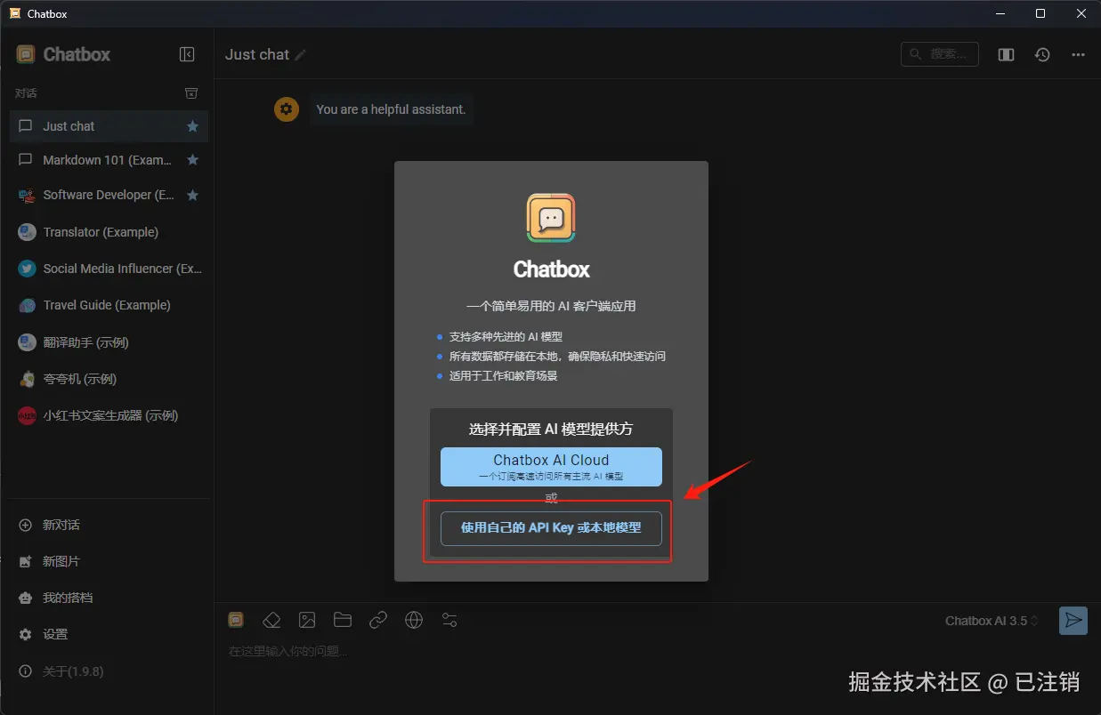 安装完成后我们打开 ChatBox,选择“使用自己的 API Key 或本地模型”。