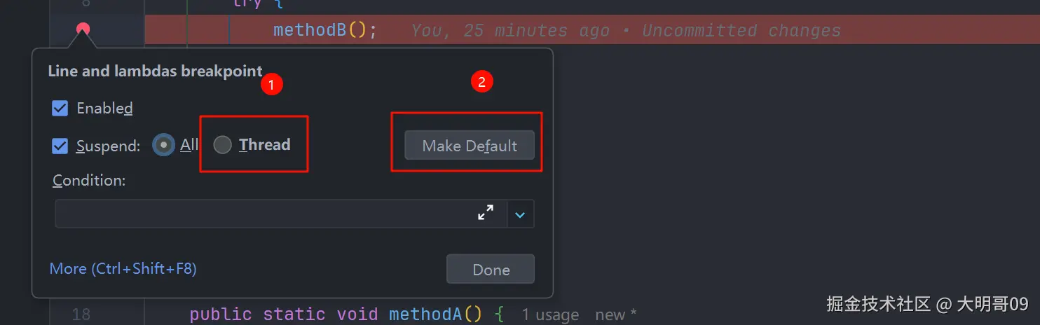 - 我们首先在 methodB() 打上一个断点