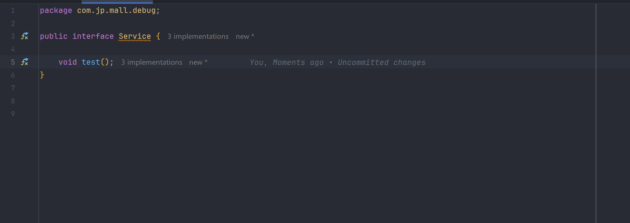 在运行时,你怎么知道他要进入哪个类的 test() 方法呢?有些小伙伴可能就会在 ServiceA、ServiceB、ServiceC 中都打断点(曾经我也是这么干的,初学者可以理解...),这样就可以知道进入哪个了。其实我们可以直接在接口 Service 的 test() 方法上面打断点,这样也是可以进入具体的实现类的方法: