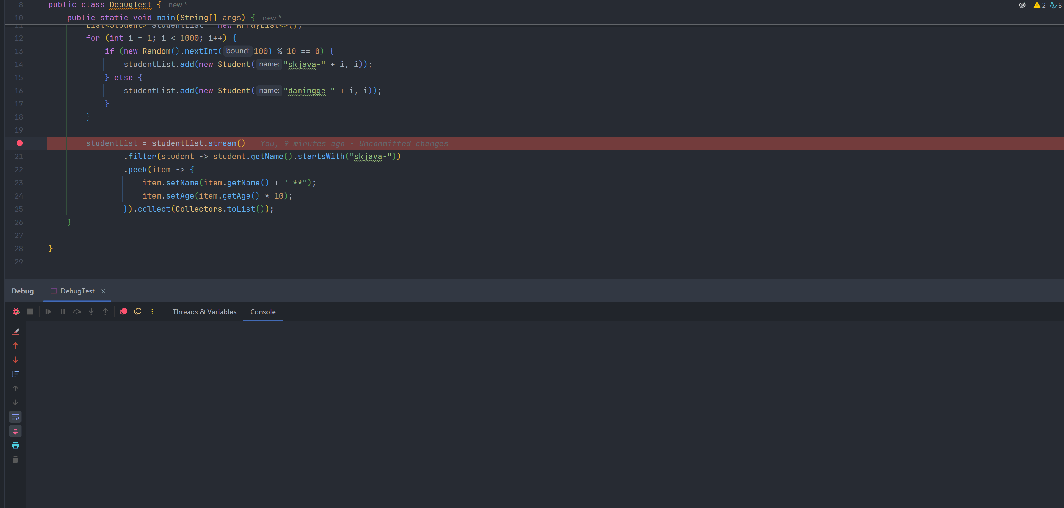 Java 中的 Stream 好用是好用,但是依然有一些小伙伴不怎么使用它,最大的一个原因就是它不好调试。你利用 Stream 处理一个 List 对象后,发现结果不对,但是你很难判断到底是哪一行出来问题。我们看下面代码: