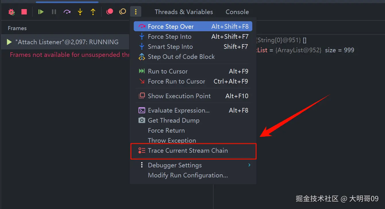 在 stream() 打上断点,运行代码,进入断点后,我们只需要点击下图中的按钮: