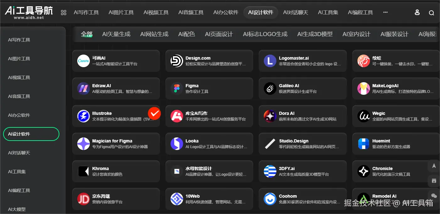 在数字化设计飞速发展的当下,AI 设计工具对设计师至关重要。我偏爱AI工具导航aidh.net 这类工具集合网站,因其工具齐全,涵盖图形、界面与网站、图像编辑处理及综合设计等方面,可一站式获取。点击操作便捷,能一键直达工具,省却网络搜索时间。还能及时知晓最新AI 设计工具动态,保持创新前沿优势。下面就深入探寻 aidh.net 中多样的 AI 设计工具及实际应用案例。
