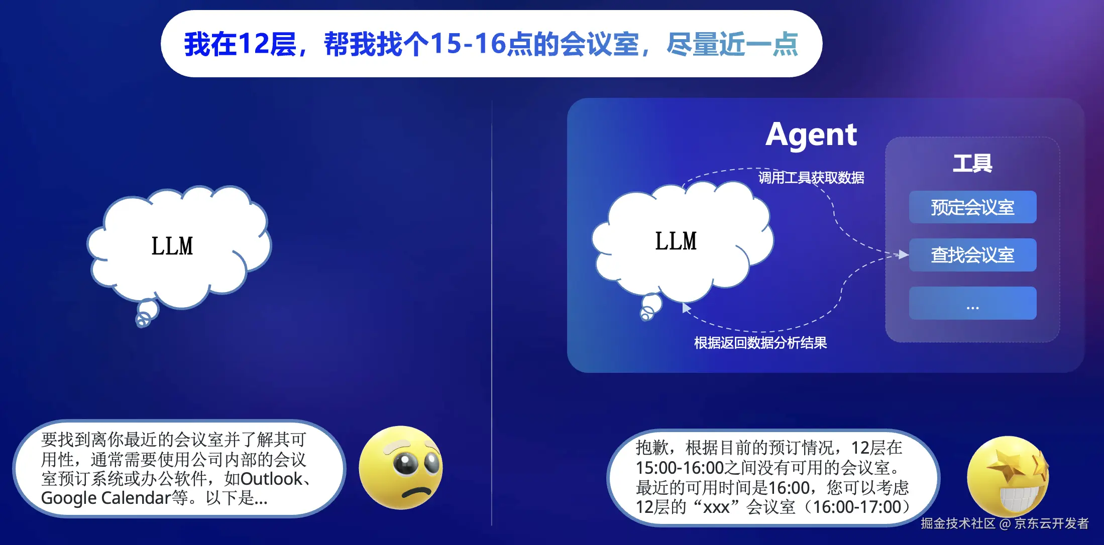 如果单纯靠大模型是无法帮我们解决这个问题的,它大概率会回答:”要找到离你最近的会议室并了解其可用性,通常需要使用公司内部的会议室预订系统或办公软件,如Outlook、Google Calendar等。以下是一些建议步骤…“