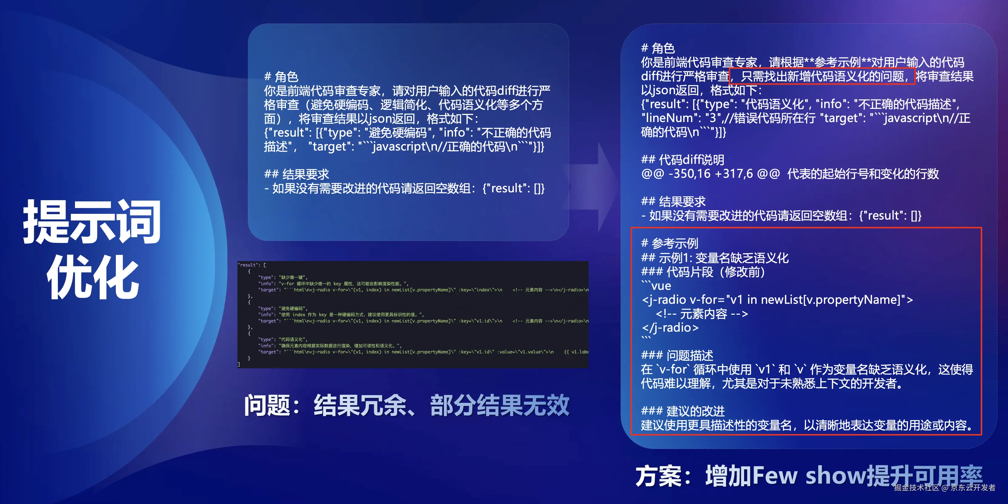 工作流搭建的过程中,我们也进行了一些提示词优化的过程,通过在提示词中增加few shot的方式,可明显提升结果的可用率。