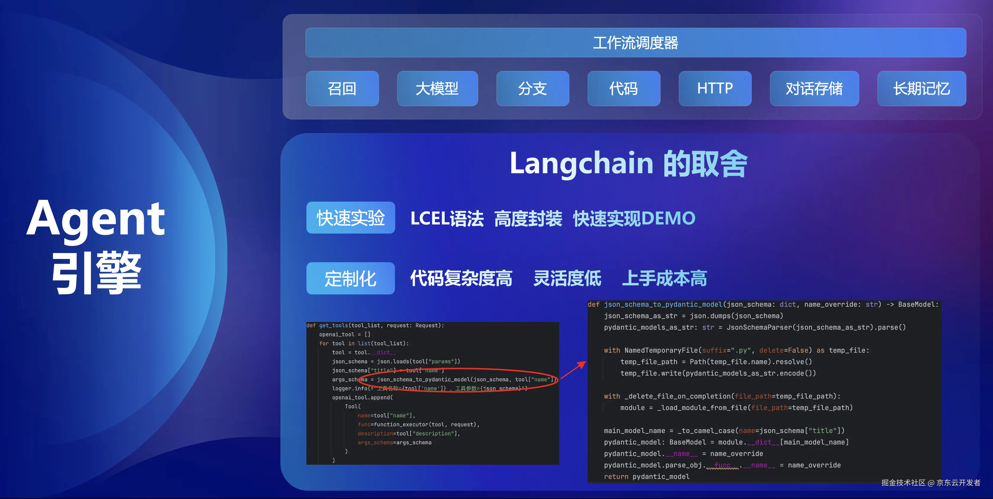 Agent引擎负责和模型交互,是影响效果和性能的核心模块。我们做了重点的设计和重构。在设计阶段,我们考虑的首要问题是:Langchain的取舍。