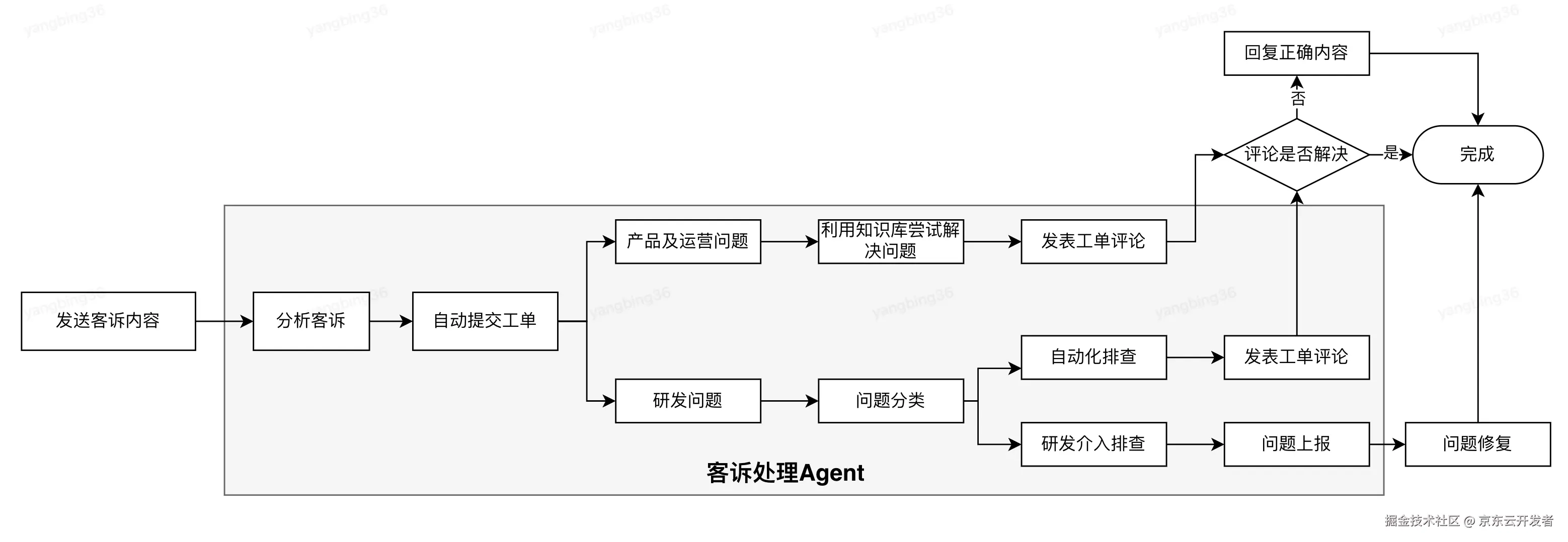 有了方案,我们借助Agent平台能力搭建了客诉处理Agent,以下是主要的工作流程