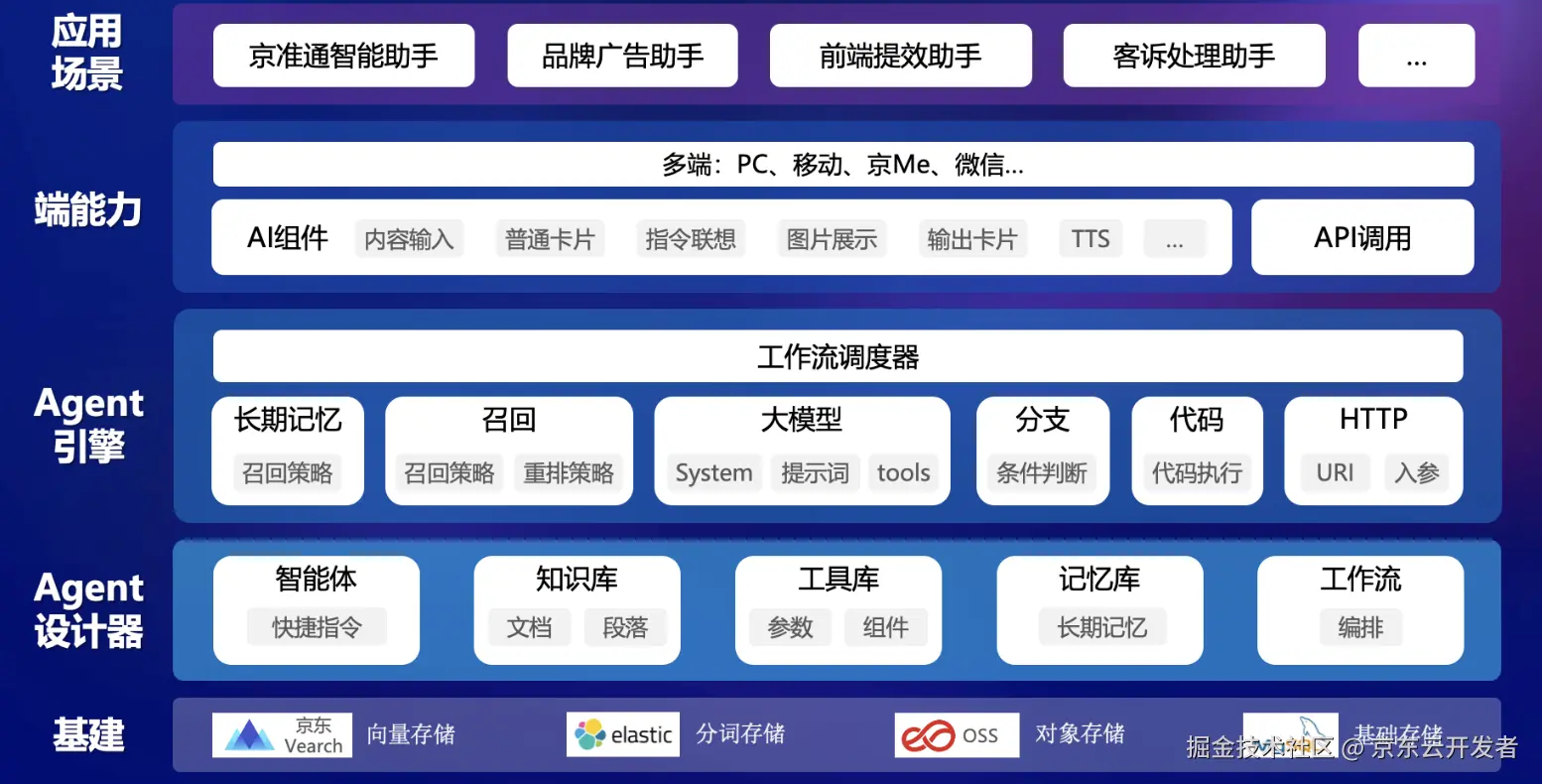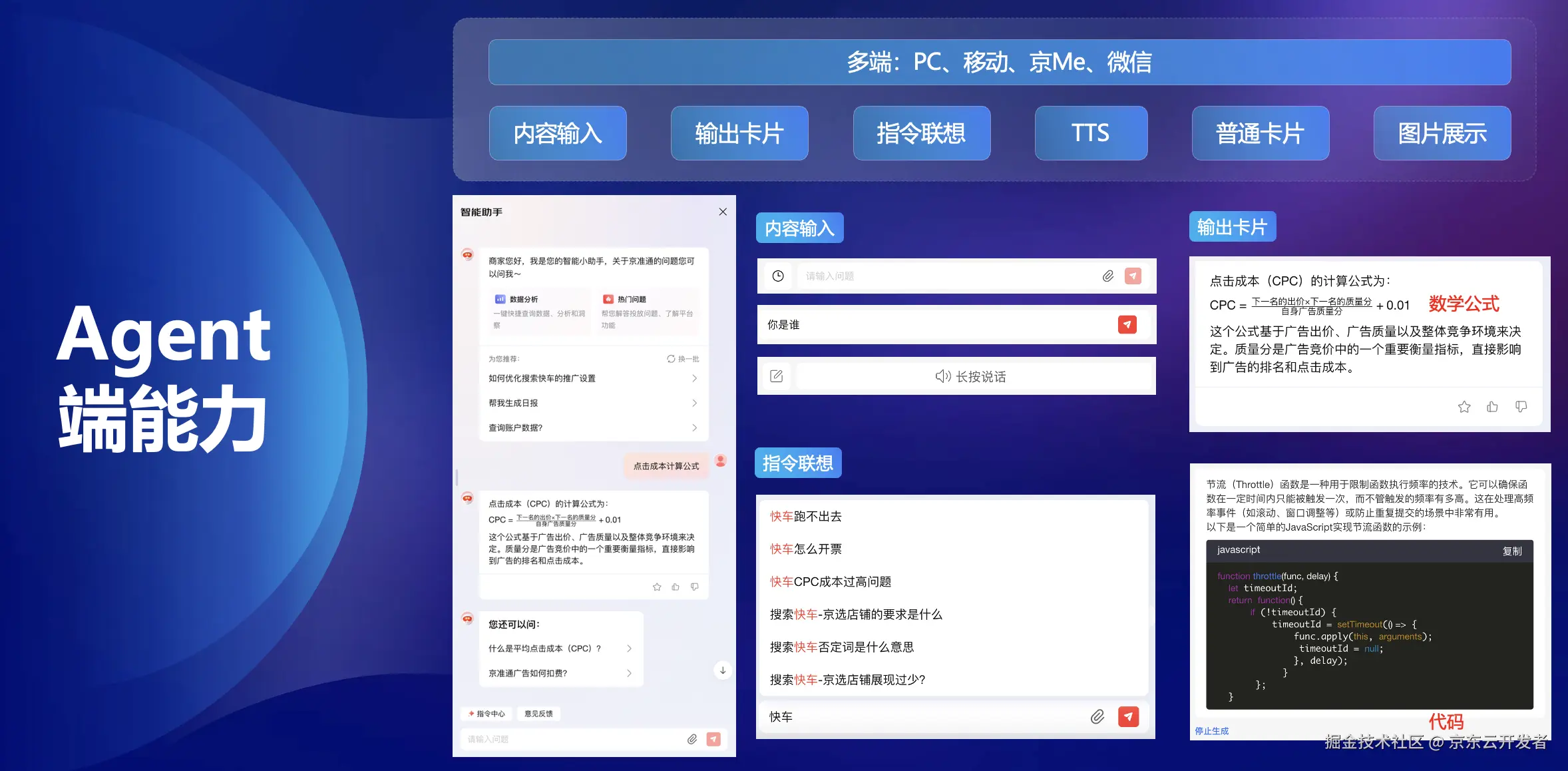 端能力: 主要是面向用户的对话式组件,这里我们沉淀了一套AI组件库,可快速组装出兼容PC、H5的对话框。与此同时,针对内部的京ME办公场景,对外如微信中的场景,我们也通过API调用的方式进行了支持。