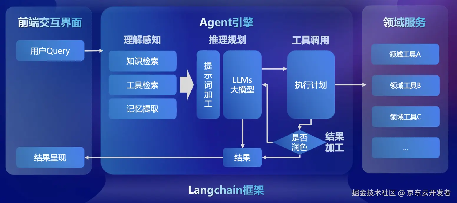 将以上各种能力整合,最终能力演变为下图。这一版底层我们采用了Langchain框架。