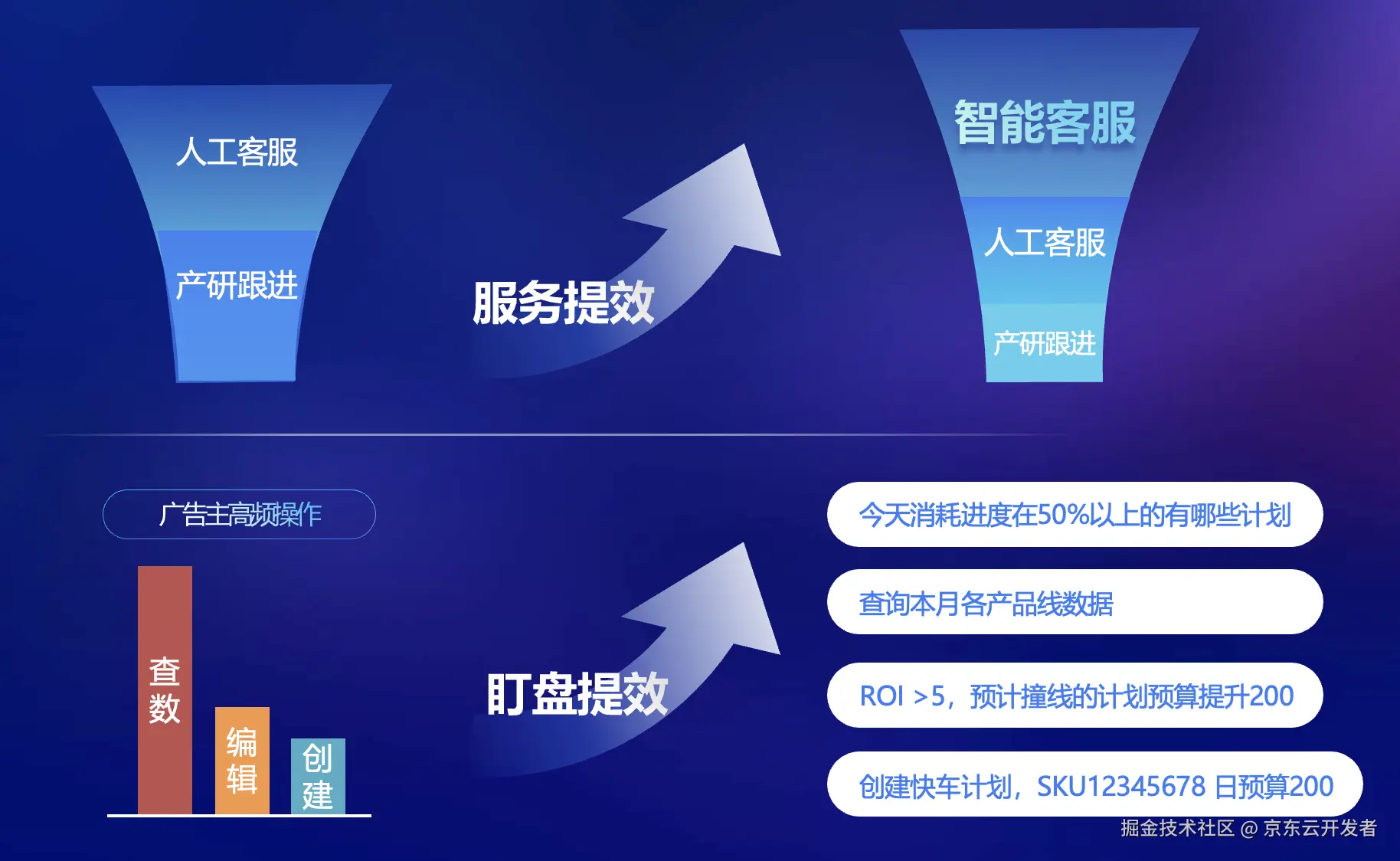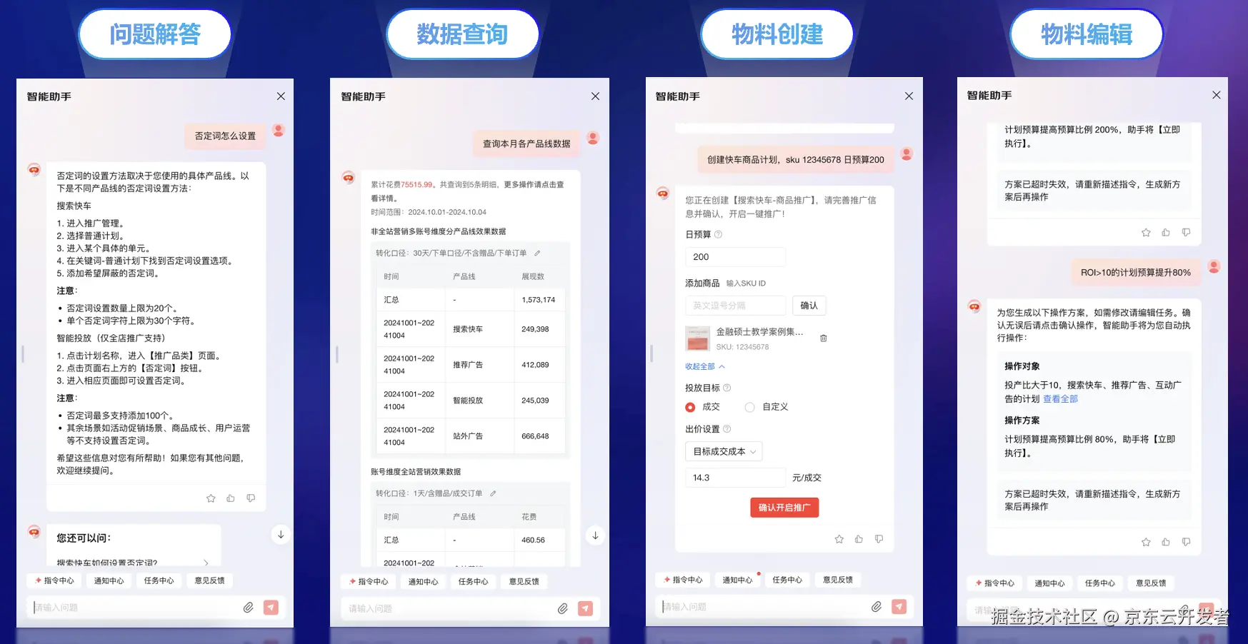 基于以上的能力,构建了京东广告智能助手。包含了问题解答、数据查询、物料创建、物料编辑等场景。